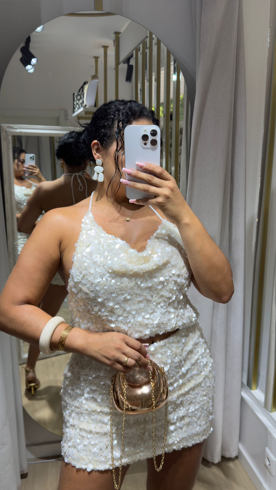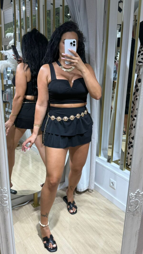 Um conjunto básico preto com saia e top de alça é uma escolha clássica, versátil e sempre elegante. Essa combinação é perfeita para várias ocasiões, desde um passeio casual até um evento mais descontraído. Você pode deixar o look mais simples e confortável.