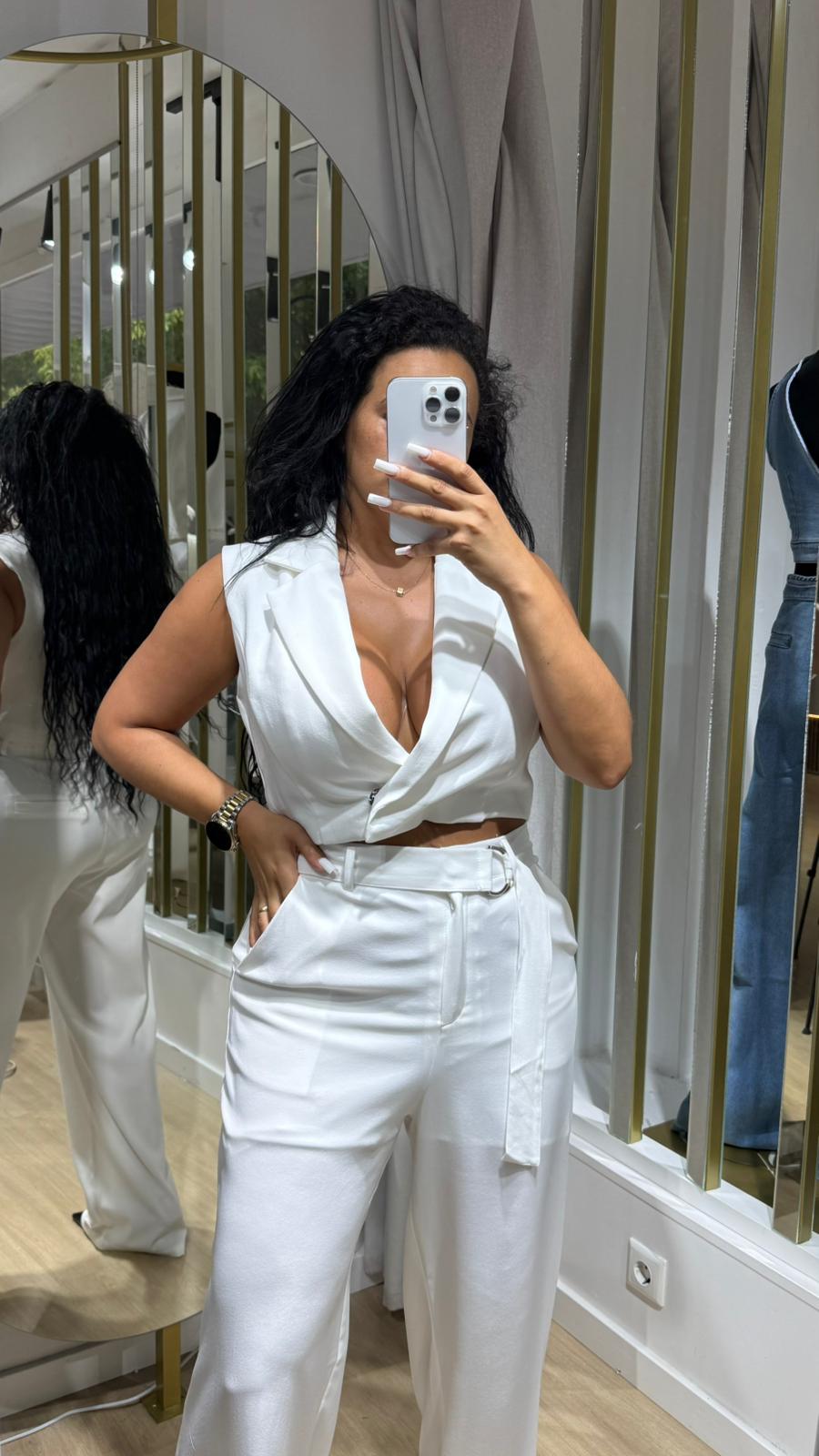 Um conjunto clássico branco é uma escolha elegante, clean e super versátil. Ele transmite uma sensação de frescor e sofisticação, além de ser fácil de combinar com acessórios de várias cores e estilos. Você pode usar esse tipo de conjunto tanto para ocasiões casuais quanto para eventos mais formais, dependendo do tecido e do corte. Para um visual mais casual, aposte em tênis ou sandálias confortáveis, e para um look mais sofisticado, escolha sapatos de salto e acessórios dourados ou prateados.